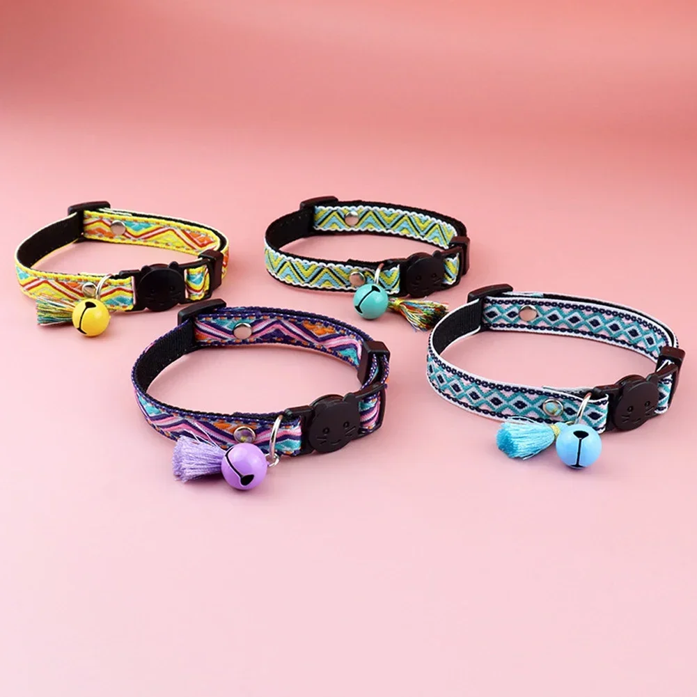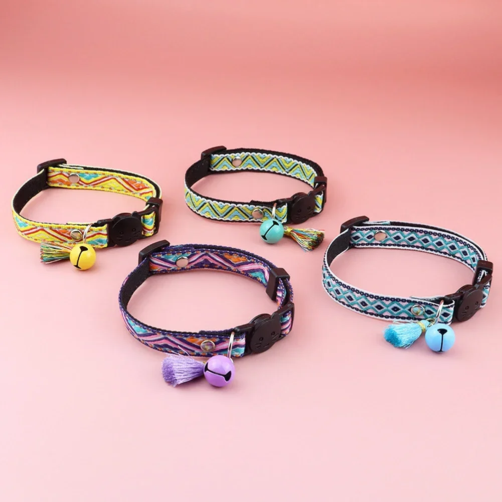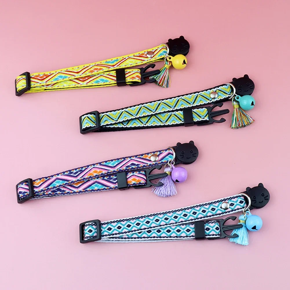 Cat Collar Adjustable Polyester Jacquard Pattern Pet Collar with Bell and Tassel Decoration for Cats and Small Dogs To Keep Lost